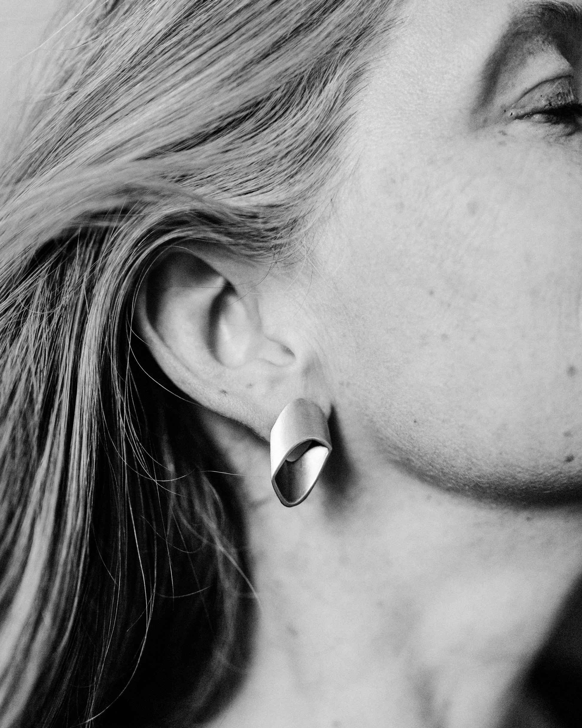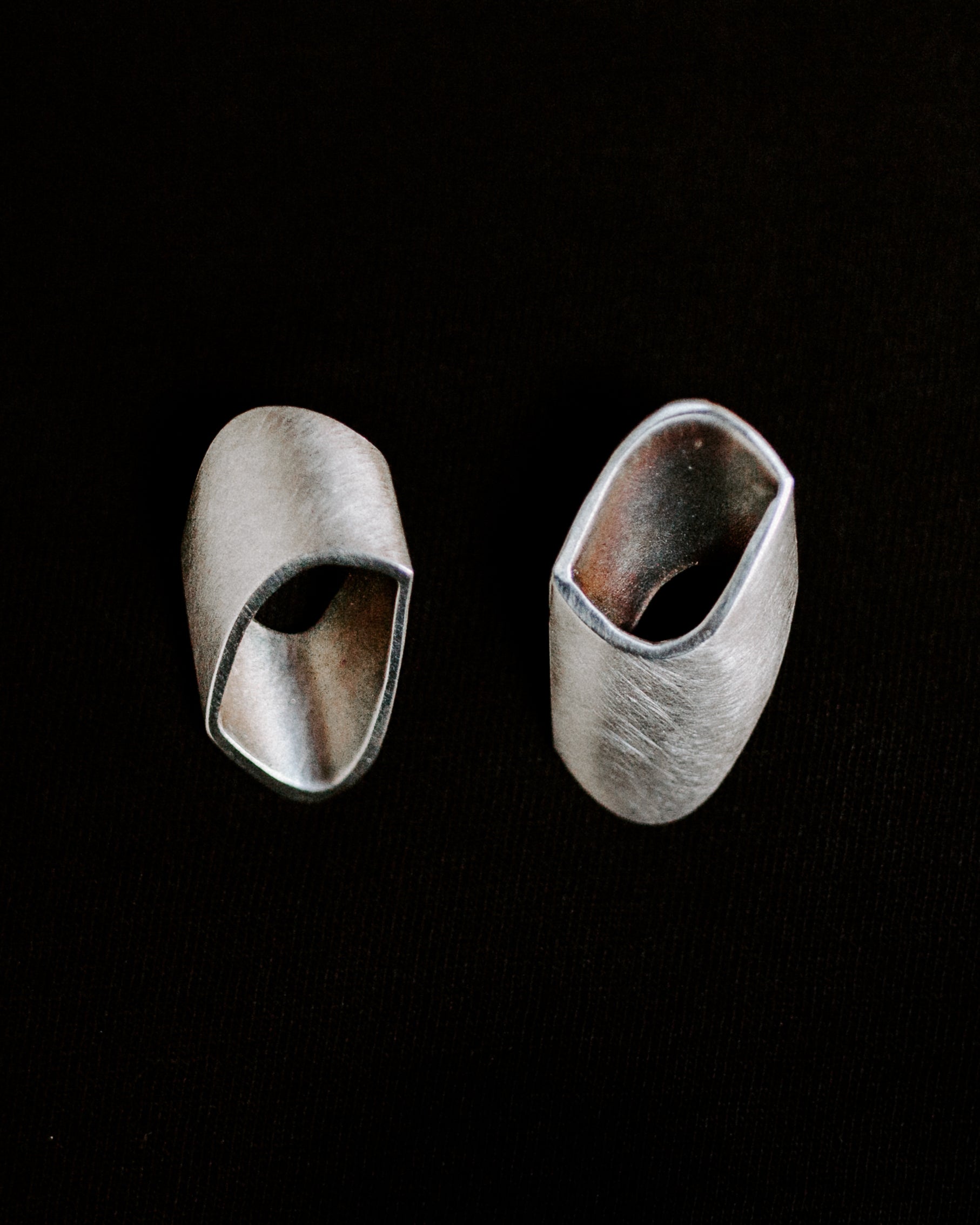 The Wave earrings are made of sterling silver. The exterior has a matte finish and the interior is lightly scratched and oxidised.
