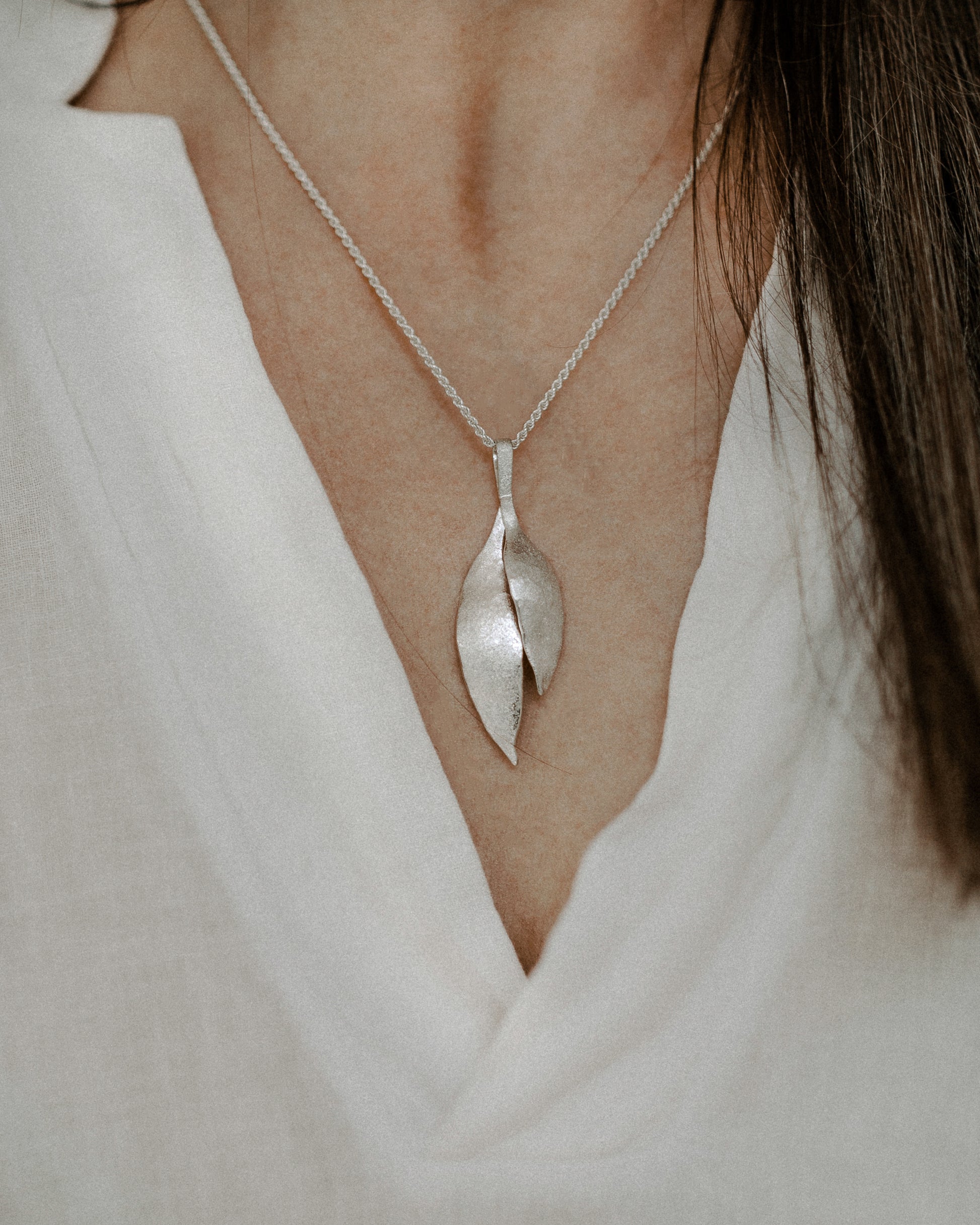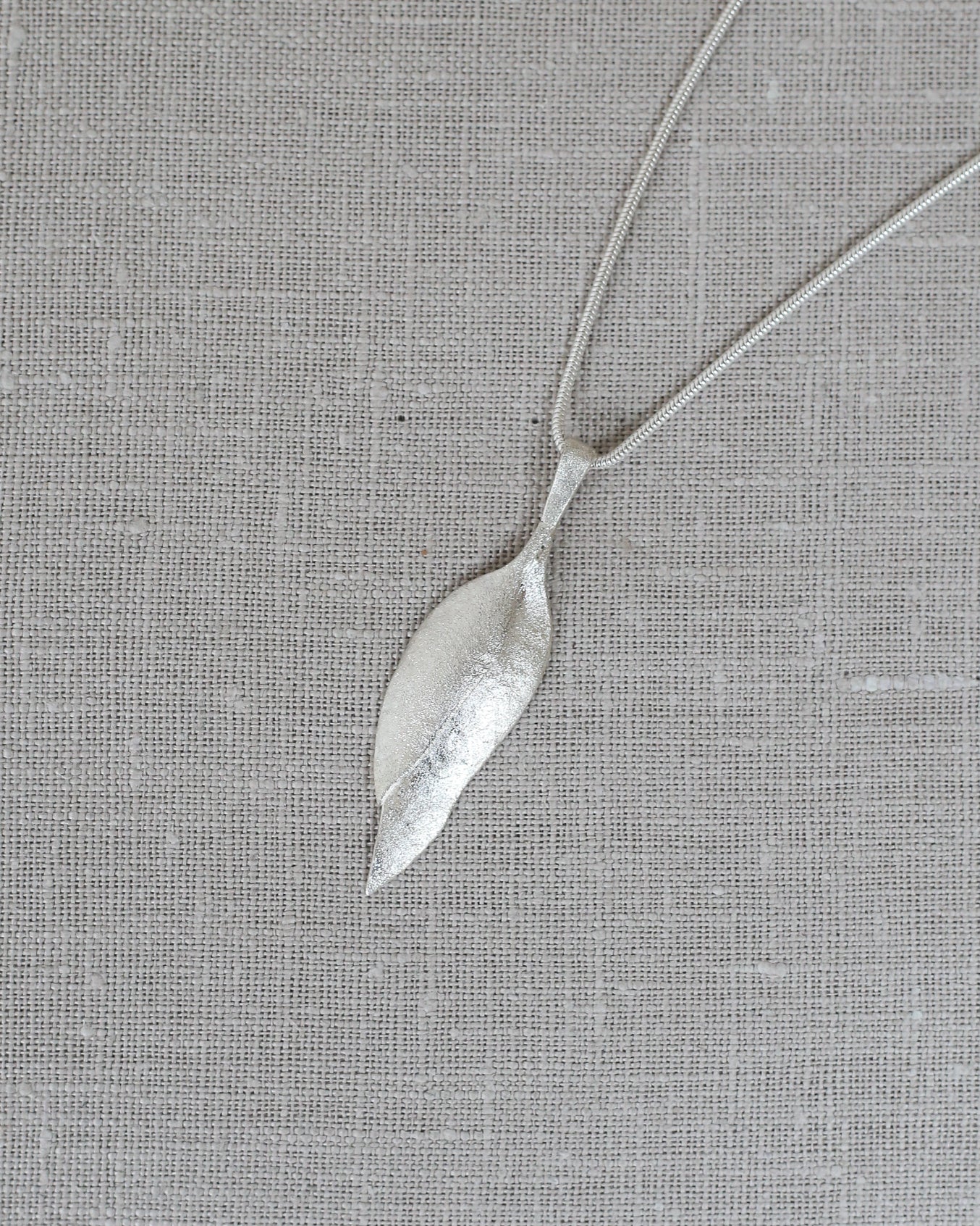 The Eucalyptus Pendant is made of sterling silver with frosted finish.